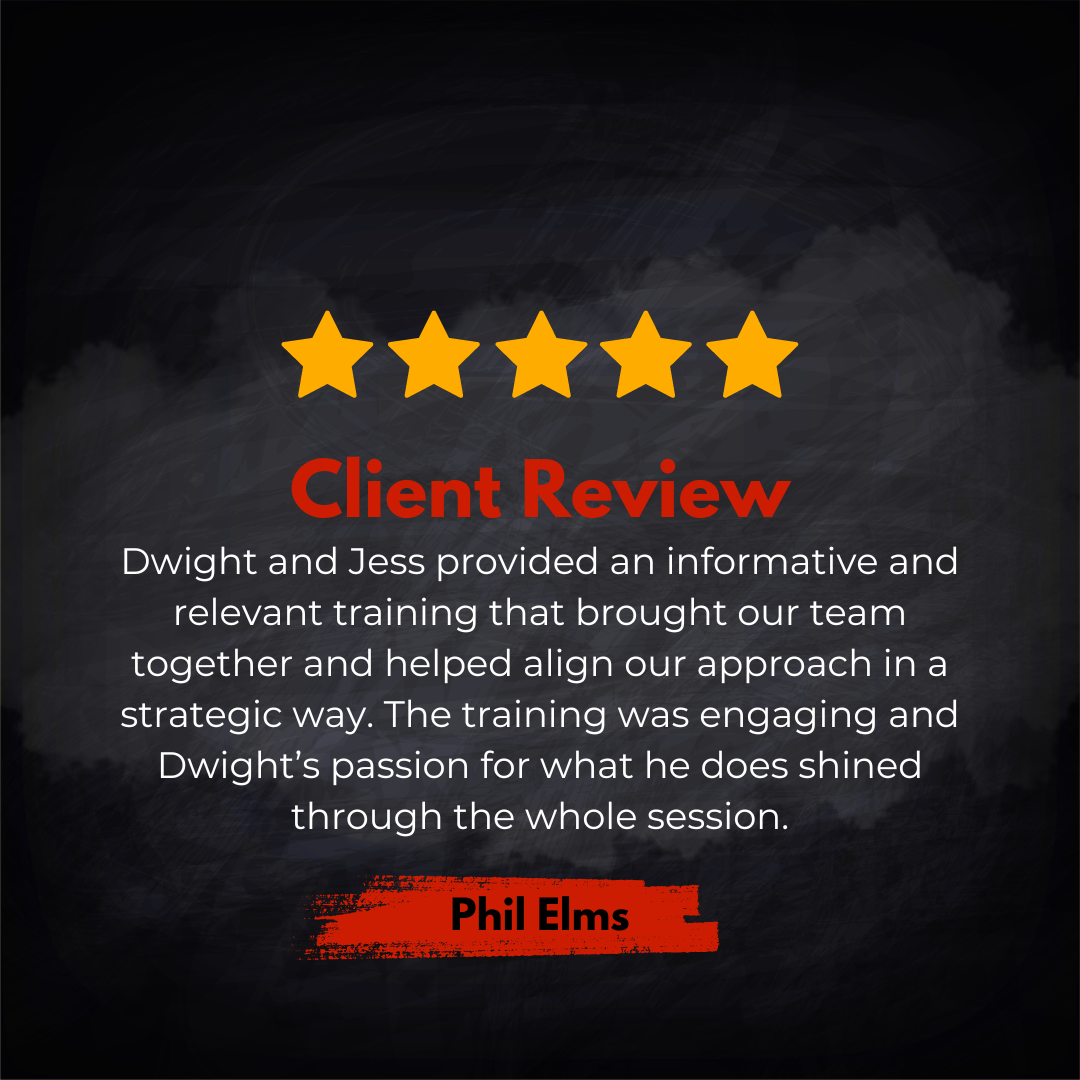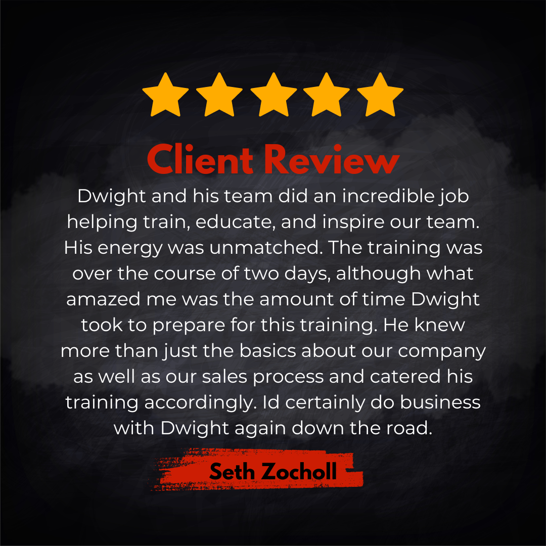 Dwight is a sought-after speaker for leadership and sales teams. He's worked with companies like Zillow, Trulia, Thumbtack, Army National Guard, Acuity Insurance, and Engine. He combines inspiring storytelling, dynamic energy, and tactical strategy to spark meaningful dialogue and ignite action. His clients love his energy and ability to inspire but its the practical tools that make a lasting impact, move the needle, and drive results. He's on a mission to help leaders spark meaningful dialogue and create a culture of ownership and commitment! IGNITE IT! 🔥