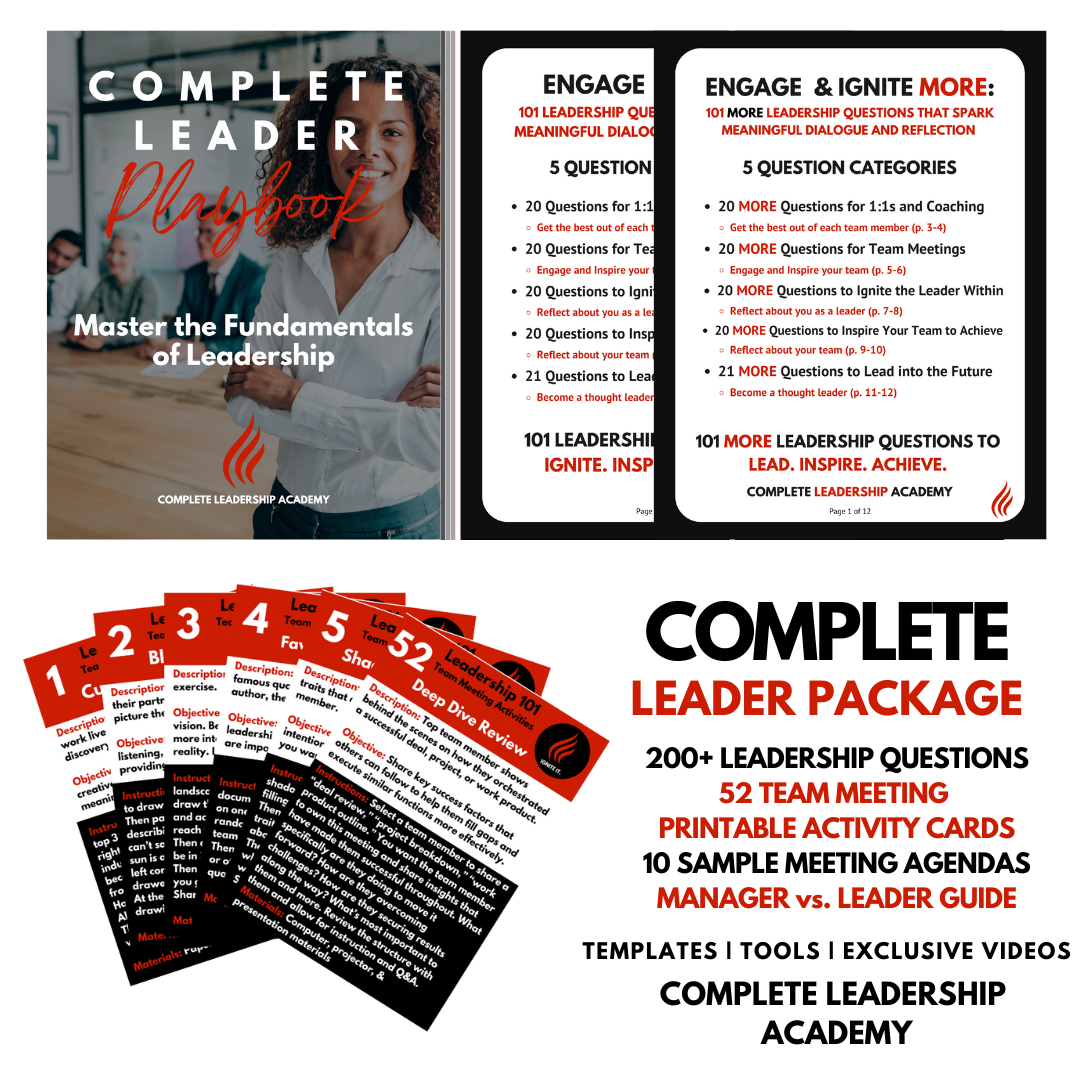 Not only do you get our popular COMPLETE LEADER Playbook, you also get over 200 Leadership Questions, 52 Team Meeting Activity Cards (one activity per week for a year), 10 Meeting Agendas,