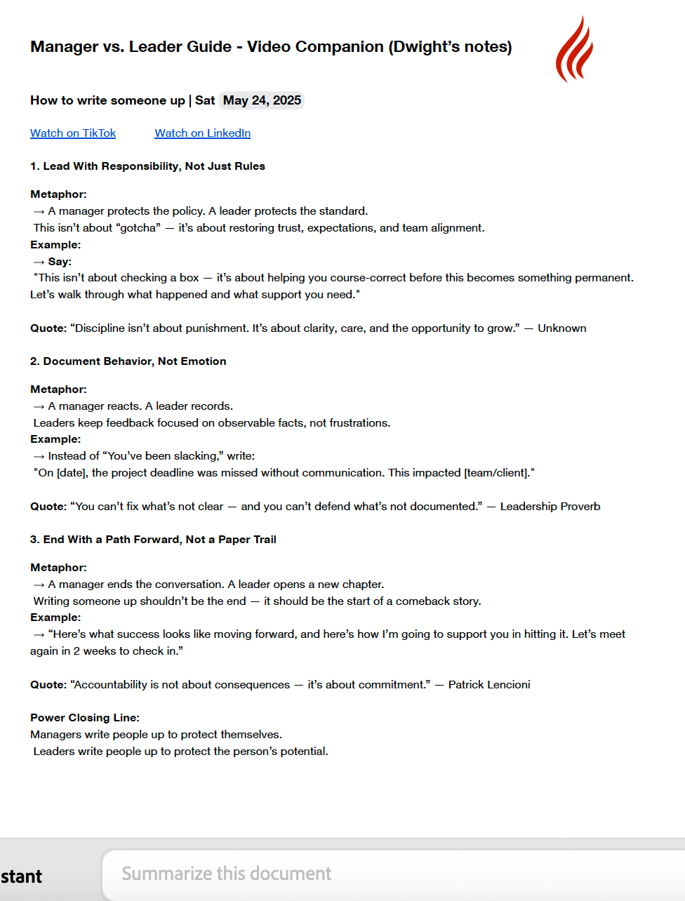 - Manager vs. Leader Guide & detailed notes from every how to…like a leader, not a manager video (over 100 topics)