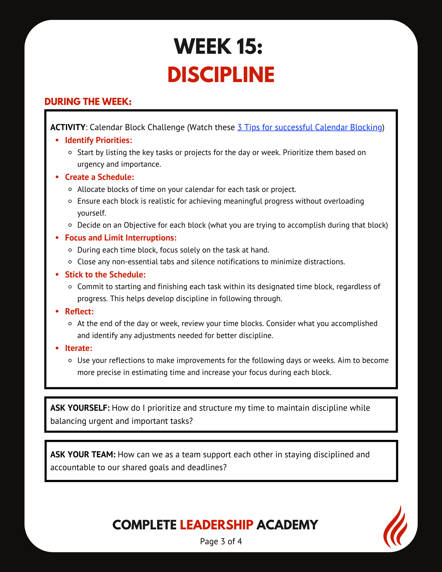 Skill-Application Activity: In-depth activity to be completed alone, in a small group, or with the team each week
